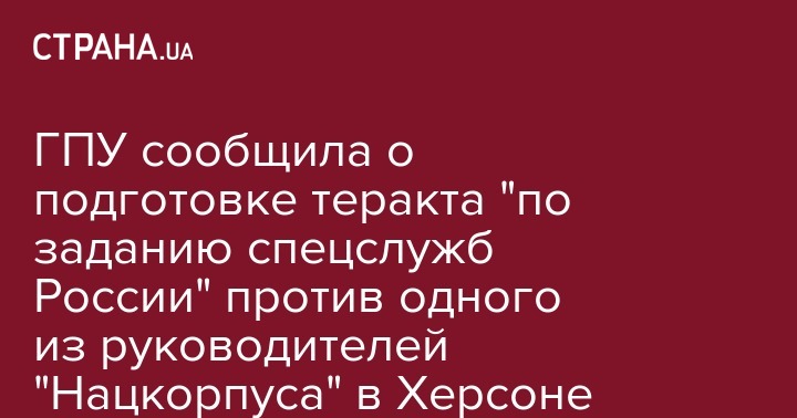 Генеральная прокуратура Украины сообщает о задержании гражданина Украины, который подозревается в совершении оконченного покушения на одного из руководителей Херсонской областной ячейки партии "Национальный корпус" по заданию спецслужб РФ.