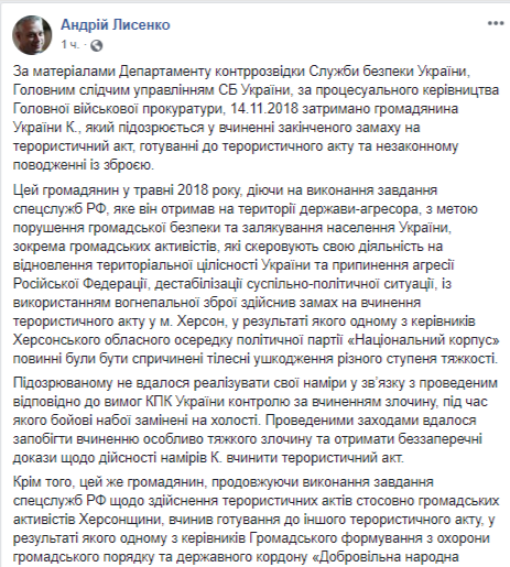 "14 ноября задержан гражданин Украины К., который подозревается в совершении оконченного покушения на террористический акт, подготовке к террористическому акту и незаконном обращении с оружием. Этот гражданин в мае 2018 года, действуя во исполнение задания спецслужб РФ, которое он получил на территории государства-агрессора… совершил покушение на совершение террористического акта в г.Херсон, в результате которого одному из руководителей Херсонской областной ячейки политической партии "Национальный корпус" должны были быть причинены телесные повреждения различной степени тяжести", - написал на своей странице в соцсети Facebook в четверг спикер Генпрокуратуры Андрей Лысенко.