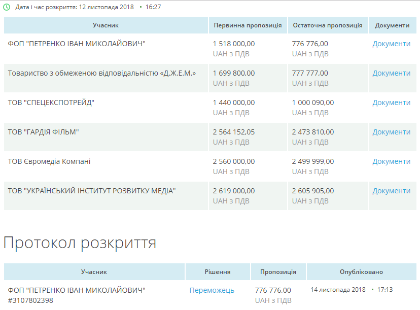 Всего в электронных торгах на закупку этой услуги участвовало шесть претендентов. ЧП Петренко И.Н. было предложено самую низкую цену - 776 тыс. 776 грн. Ожидаемая стоимость закупки составляла 2 млн 619 тыс грн.