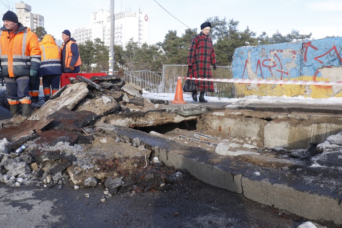 По словам коммунальщиков, лопнувшую плиту и яму на тротуаре обнаружили еще около 8:00 во время планового объезда. Однако чинить мост начали только в полдень. Провал занял почти всю ширину тротуара. Полоса в сторону бульвара Перова перекрыта для движения транспорта.