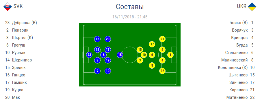 Словакия: Дубравка - защита Пекарик, Шкртел, Шкриниар, Ганцко - полузащита Грегуш - Руснак, Куцка, Гамшик, Мак - нападение Зрелак.