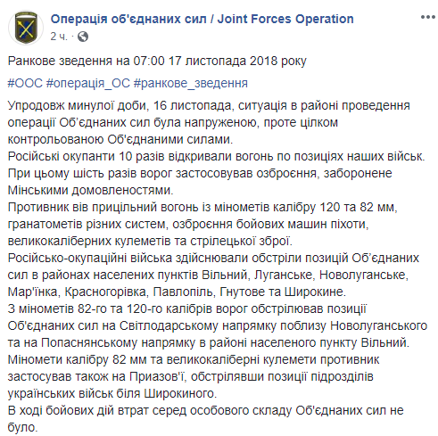Боевики десять раз открывали огонь по позициям украинских войск. При этом шесть раз применялось вооружение, запрещенное минского договоренностями. Противник вел прицельный огонь из минометов калибра 120 и 82 мм, гранатометов различных систем, вооружения боевых машин пехоты, крупнокалиберных пулеметов и стрелкового оружия.