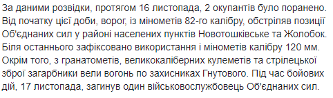На Донбассе в зоне проведения операции Объединенных сил 16 ноября погиб один украинский военный. Об этом сообщает пресс-центр ООС в Facebook.