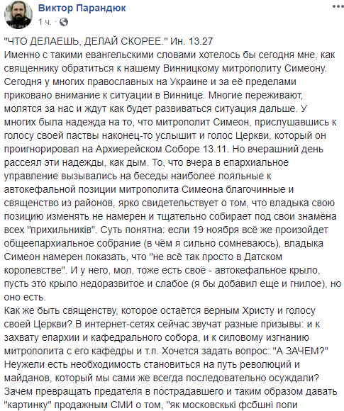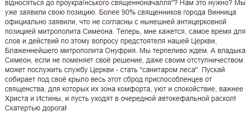 В Виннице в епархиальное управление вызывались на беседы священнослужители, которые наиболее благосклонны к позиции митрополита Симеона, который не  подписал постановление, осуждающее намерение Константинополя предоставить автокефалию украинской церкви.  Об этом в Facebook сообщил винницкий священник Виктор Парандюк.