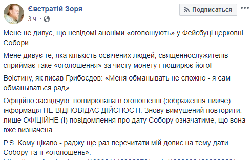 "Меня не удивляет, что неизвестные анонимы "объявляют" в Фейсбуке церковные Соборы. Удивляет, какое количество образованных людей, священнослужителей принимает такое "объявление" за чистую монету и распространяет его", - рассказал священнослужитель.