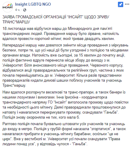 Общественная организация Insight LGBTQ NGO обнародовала заявление по срыву Трансмарша, в котором заявили, что в Украине устанавливается праворадикальная диктатура.