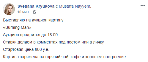 19 ноября заместитель главного редактора "Страны" Светлана Крюкова объявила на своей странице в Facebook о новом аукционе для любителей искусства.