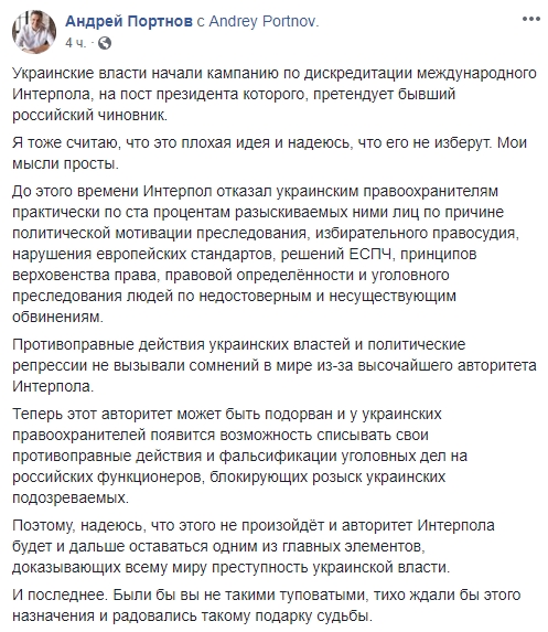В то же время юрист Андрей Портнов считает, что украинским политикам назначение россиянина пошло бы на пользу. Теперь они смогли бы списывать отказы Интерпола на "происки Москвы".