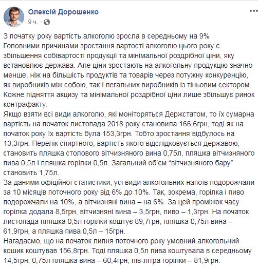 По словам Дорошенко, суммарная стоимость всех видов алкоголя, которые мониторятся Госстатом, на начало ноября 2018 составляла 166,6 грн, тогда как на начало года их стоимость была 153,3 грн. То есть рост произошел на 13,3 грн. Перечень спиртного, стоимость которого отслеживается государством, составляет: бутылка столового отечественного вина 0,75 л, бутылка отечественного пива 0,5 л и бутылка водки 0,5 л. Общий объем "отечественного бара" составляет 1,75 л.