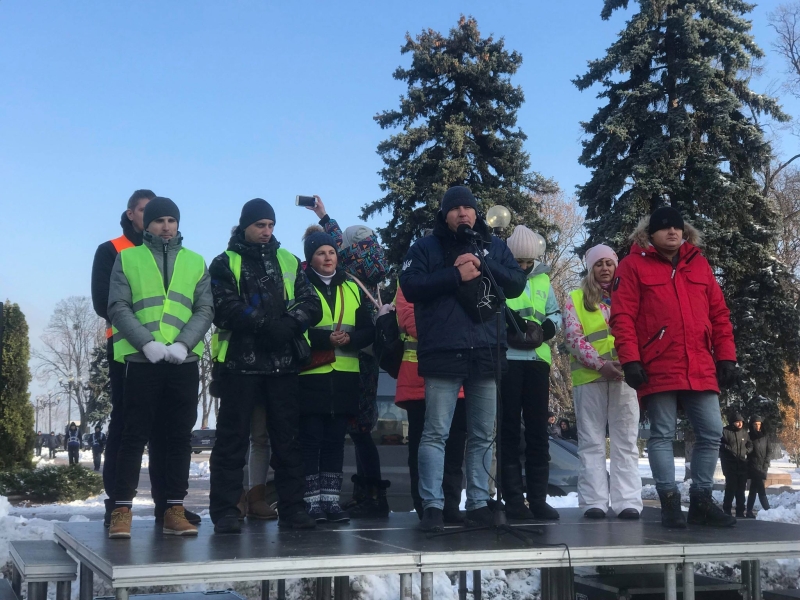 12:30 Митингующие установили на платформу сгоревший автомобиль марки Range Rover стоимостью десять тысяч евро, который сжег лидер движения "Авто Евро Сила" Олег Ярошевич. По словам владельца, оно "стало своеобразным символом несогласия с антинародными законами, которые приняли наши депутаты"