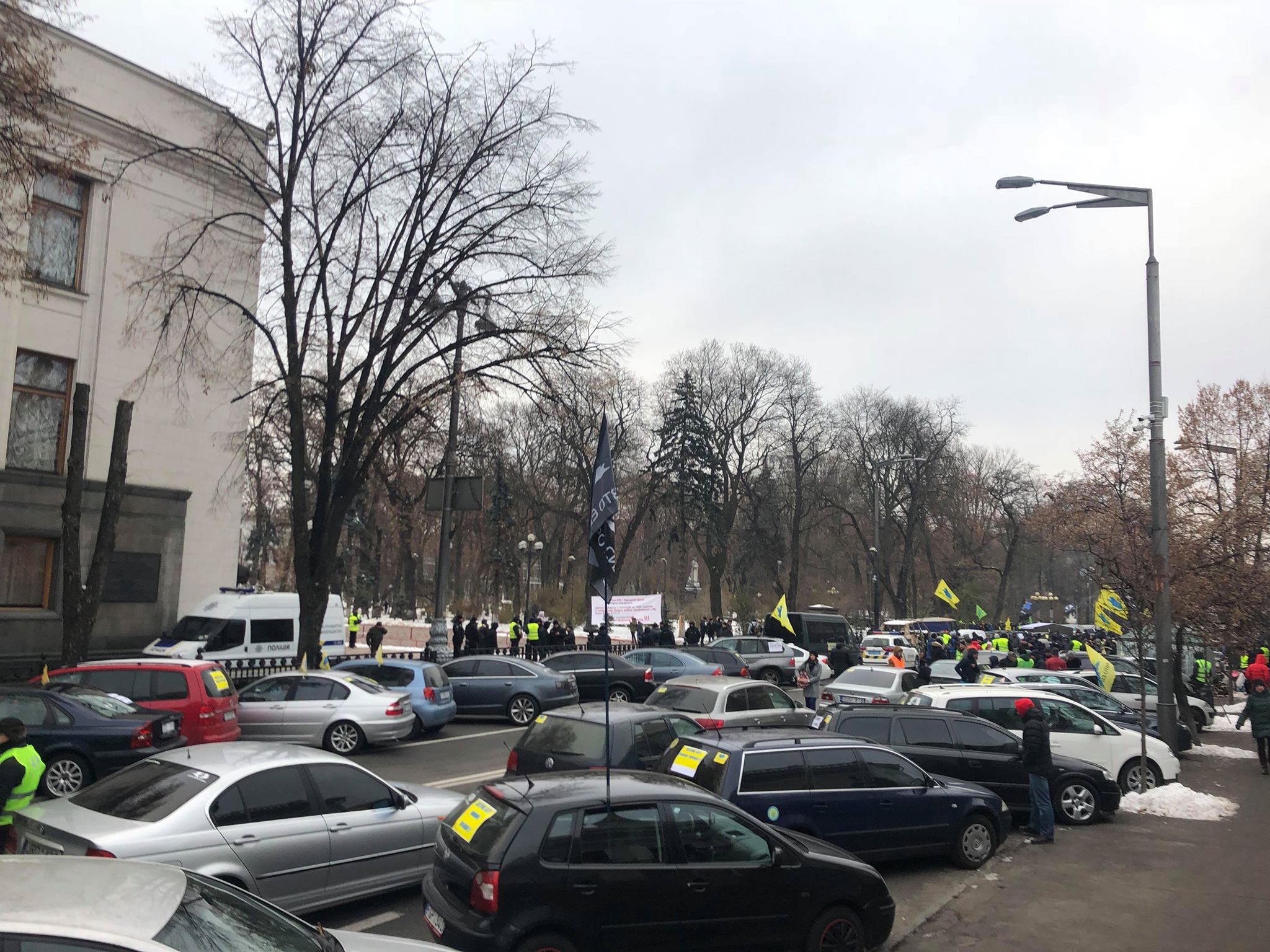 9:00  Участники протеста уже под Верховной Радой. Сейчас там около сотни автомобилей. Они перекрывают улицу Грушевского.