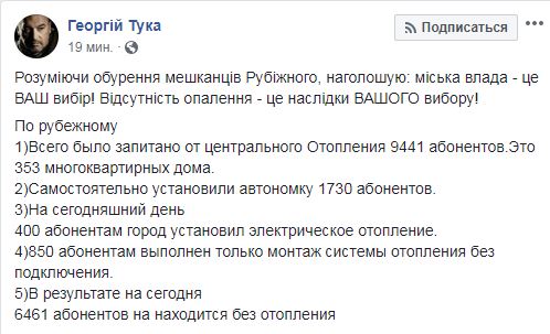 "Понимая возмущение жителей Рубежного, подчеркиваю: городская власть - это ВАШ выбор! Отсутствие отопления - это последствия ВАШЕГО выбора!", - заявил Тука. Он сообщил, что по Рубежному от центрального отопления был запитан 9 441 абонент или 353 многоквартирных дома.