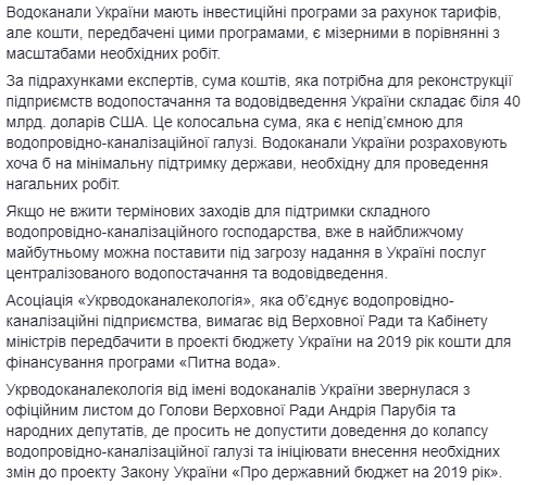 Указано, что "Укрводоканалэкология" от имени водоканалов обратилась с официальным письмом к председателю Верховной Рады Андрею Парубию и народным депутатам, где просит не допустить доведения до коллапса водопроводно-канализационной отрасли и инициировать внесение необходимых изменений в проект закона Украины "О государственном бюджете на 2019 год".