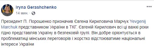 "Президент Порошенко назначил Евгения Кирилловича Марчука представителем Украины в ТКГ. Евгений Кириллович все эти трудные годы достойно представлял Украину в безопасностной группе. Он хорошо ориентируется в проблематике минских переговоров и будет жестко отстаивать национальные интересы Украины", - написала Геращенко.