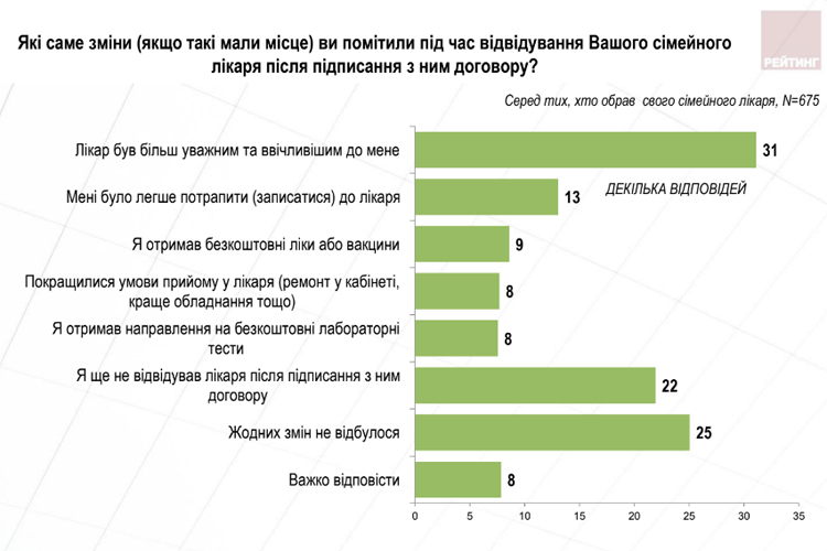 Оказалось, что 56% украинцев уже выбрали своего семейного врача. Треть респондентов (31%) высоко оценили уровень профессионализма и компетентности врачей в Украине. В то же время, в июне таких опрошенных было 39%. Почти две трети заявили о том, что знают своего семейного врача или терапевта. 42% опрошенных еще не подписали договор с семейным врачом. Быстрее определились с терапевтом в западных и восточных макрорегионах, женщины и старших по возрасту люди.