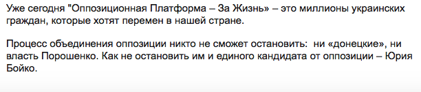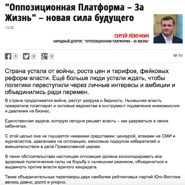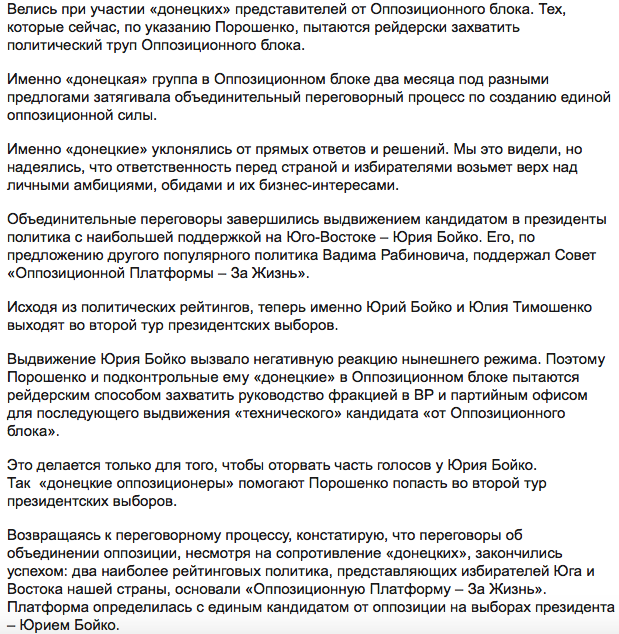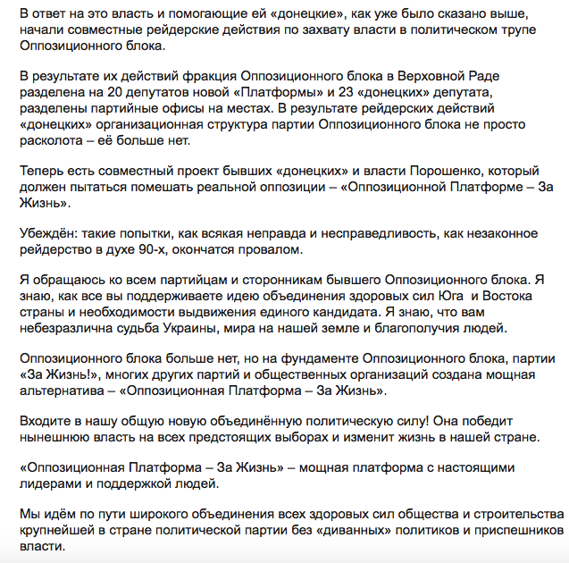 "Настоящая оппозиция должна консолидировать все здоровые политические силы на борьбу с нынешним режимом, объединиться и выдвинуть против власти единого кандидата. Такие объединительные переговоры двух наиболее рейтинговых партий Юго-Востока (Оппозиционного блока и За життя - Прим.Ред.) велись давно, долго и упорно. Велись при участии "донецких" представителей от Оппозиционного блока (видимо имеются в виду партийцы, близкие к Ринату Ахметову - Прим.Ред.). Тех, которые сейчас, по указанию Порошенко, пытаются рейдерски захватить политический труп Оппозиционного блока, - пишет Левочкин. - Именно "донецкая" группа в Оппозиционном блоке два месяца под разными предлогами затягивала объединительный переговорный процесс по созданию единой оппозиционной силы. Именно "донецкие" уклонялись от прямых ответов и решений".