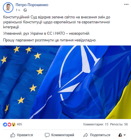 Президент Украины Петр Порошенко просит Верховную Раду безотлагательно рассмотреть вопрос о внесении изменений в Конституцию касаемо европейской и евроатлантической интеграции страны после соответствующего решения, принятого Конституционным судом Украины 22 ноября. Об этом написал глава государства на своей странице в Facebook.