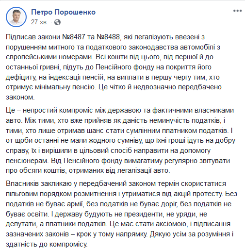 Владельцев призываю в предусмотренный законом срок воспользоваться льготным порядком растаможивания и воздержаться от акций протеста. Без налогов не бывает армии, без налогов не бывает дорог, без налогов не бывает образования. И государство строят не президенты, не правительства, не депутаты, а налогоплательщики. Это должно стать аксиомой, и подписание указанных законов - шаг в этом направлении. Спасибо всем за понимание и способность к компромиссу", - написал Порошенко.