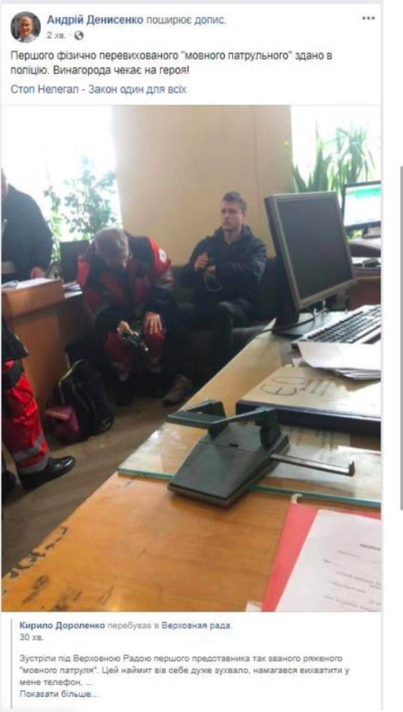 "Первого физически перевоспитанного "мовного патрульного" сдали в полицию. Вознаграждение ждет своего героя", - написал депутат.