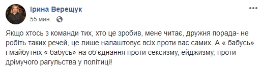 Экс-мэр Равы-Русской Ирина Верещук осуждает такой "креатив: "Если кто-то из команды тех, кто это сделал, меня читает, дружеский совет - не совершайте таких вещей, это только настраивает всех против вас самих. А "бабушек" и будущих "бабушек" на объединение против сексизма, ейджизма, против дремучего рагульства в политике!"