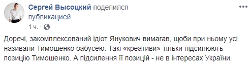 Депутат Сергей Высоцкий вспоминает, кто еще оскорбительно высказывался о Тимошенко: "Кстати, закомплексованный идиот Янукович потребовал, чтобы при нем все называли Тимошенко бабушкой. Такие "креативы" только усиливают позицию Тимошенко. А усиление ее позиций - не в интересах Украины".