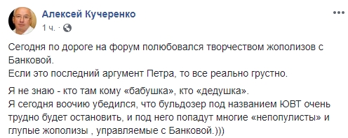 Экс-министр ЖКХ Алексей Кучеренко: "Сегодня по дороге на форум полюбовался творчеством жополизов с Банковой. Если это последний аргумент Петра, то все реально грустно.