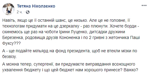 Журналист Татьяна Николаенко пишет: "Даже если это ее последний шанс, это низко. Но это не главное, ее технологам придумать на это зеркалку - раз плюнуть. Хотите борды - скинемся еще раз на сапоги Ирины Луценко, детсады жены Березенко, месторождения друзей Кононенко и по 2 гривны с жетончика Паши Фукса???