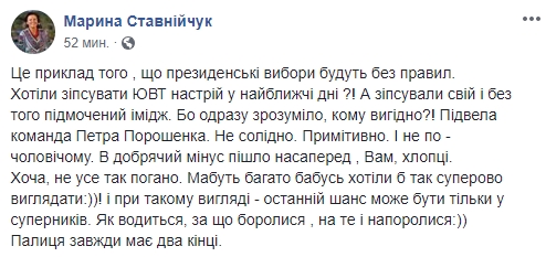 Политик Марина Ставнийчук тоже высказывает свои предположения об авторах плакатов: "Это пример того, что президентские выборы будут без правил. Хотели испортить ЮВТ настроение в ближайшие дни?! А испортили свой и без того пошатнувшийся имидж. Потому что сразу понятно, кому выгодно?! Подвела команда Петра Порошенко. Не солидно. Примитивно. И не по - мужски. Хороший минус ушел в первую очередь вам, ребята.