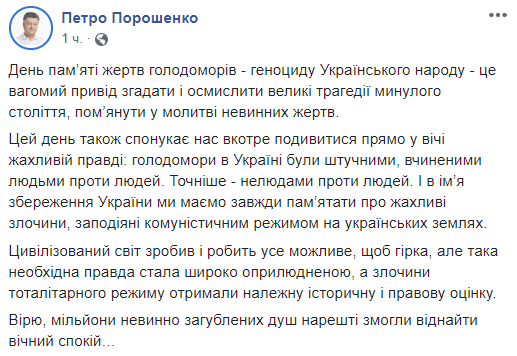 Премьер-министр Украины Владимир Гройсмана написал: "85 лет назад руководство СССР допустило геноцид против украинского народа. Миллионы людей стали жертвами голодомора, искусственно создал советский режим. Это преступление не имеет срока давности".