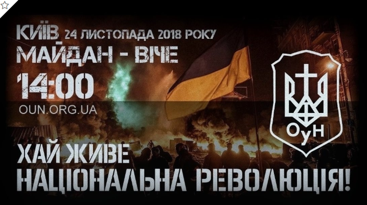 Глава ОУН Николай Кохановский призывает людей выйти 24 ноября в 14:00 на Майдан. Здесь состоится мероприятие, приуроченное к празднованию пятой годовщины Революции Достоинства. Акция пройдет под лозунгом "Пусть живет национальная революция".