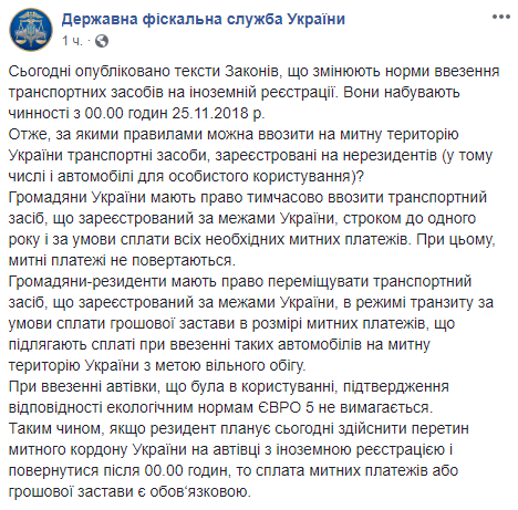 В фискальной службе напомнили, что законы о новых нормах ввоза "евроблях" в Украину вступают в силу с 00:00 25 ноября. Украинцы смогут временно ввозить такое авто сроком до одного года и при условии уплаты всех необходимых таможенных платежей. При этом они не возвращаются.