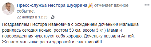 У народного депутата Нестора Шуфрича родилась дочь. Об этом в Facebook сообщает пресс-служба политика.