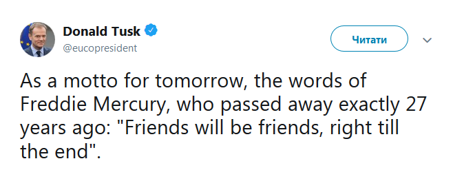 "В качестве завтрашнего девиза - слова ушедшего из жизни ровно 27 лет назад Фредди Меркьюри: "Друзья останутся друзьями до самого конца", - написал Туск.