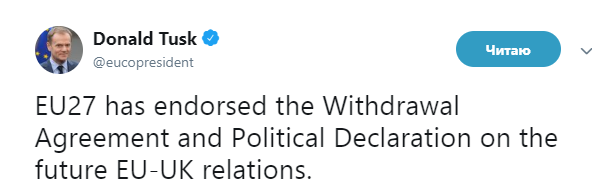 "27 государств-членов ЕС одобрили соглашение о выходе Великобритании из ЕС и политическую декларацию относительно будущих отношений между ЕС и Великобританией", - сказано в сообщении.