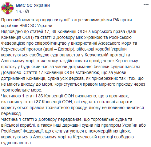 "Статья 17 конвенции ООН по морскому праву устанавливает, что при условии соблюдения Конвенции, суда всех государств, как прибрежных так и не имеющих выхода к морю, пользуются правом мирного прохода через территориальное море. Ч.1 ст.36 конвенции ООН определенно, что в проливах, указанных в ст.37 Конвенции ООН, все суда и летательные аппараты пользуются правом транзитного прохода, которому не должно оказываться препятствий. Ч.1 ст.2 договора (об использования Азовского моря и Керченского пролива) предусматривает, что торговые суда и военные корабли, а также другие государственные суда под флагом Украины или РФ, эксплуатирующиеся в некоммерческих целях, пользуются в Азовском море и Керченском проливе свободой судоходства", - отмечается в сообщении.