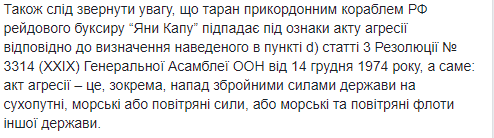 Таран пограничным кораблем России украинского рейдового буксира "Яни Капу" подпадает под признаки акта агрессии в соответствии с определением п.d ст.3 резолюции №3314 (ХХIХ) Генассамблеи ООН от 14 декабря 1974 года. Так заявили в ВМС Украине в соцсети Facebook.