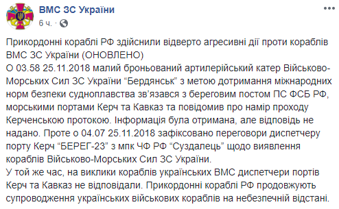 "В 03.58 25.11.2018 малый бронированный артиллерийский катер Военно-морских сил ВС Украины "Бердянск" с целью соблюдения международных норм безопасности судоходства связался с береговым постом ПС ФСБ РФ, морскими портами Керчь и Кавказ и сообщил о намерении прохода по Керченскому проливу. Информация была получена, но ответ не предоставлен", - говорится в сообщении ВМС ВСУ в Facebook.