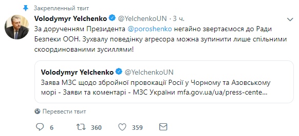 Украина планирует обратиться в Совет безопасности Объединенных Наций (ООН) из-за нападения российских кораблей на украинские в Керченском проливе. Об этом сообщил постоянный представитель Украины в ООН Владимир Ельченко своем микроблоге Twitter.