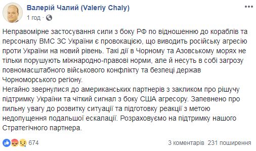"Немедленно обратились к американским партнерам с призывом о решительной поддержке Украины и четком сигнале со стороны США агрессору. Были заверены о пристальном внимании к развитию ситуации и подготовке реакции с целью недопущения дальнейшей эскалации", - написал посол Украины в США Валерий Чалый на своей странице в Facebook.