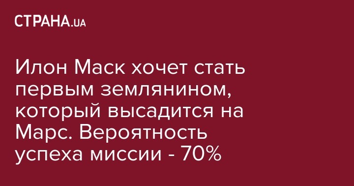 Знаменитый американский бизнесмен, основатель компании Tesla Илон Маск заявил о том, что планирует стать первым землянином, который ступит на поверхность Марса. Он планирует отправиться на Красную планету на ракете SpaceX. Причем вероятность успеха своей миссии он оценил в 70%.