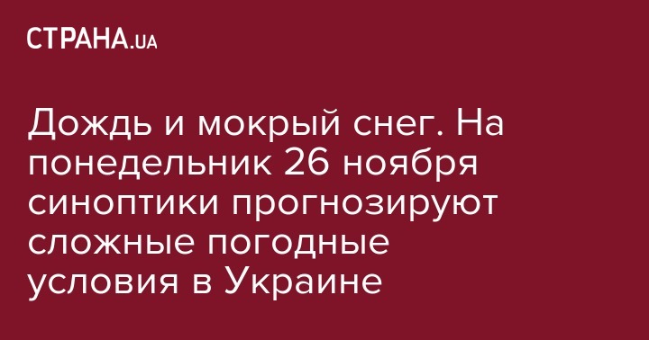 В понедельник, 26 ноября, на всей территории Украины ожидается пасмурная погода с осадками.  На западе, севере, востоке и в центре страны синоптики прогнозируют мокрый снег с дождем. На Закарпатье, и в южных регионах - дождь, днем температура там поднимется до + 7...+9 градусов. Об этом сообщает Укргидрометцентр.