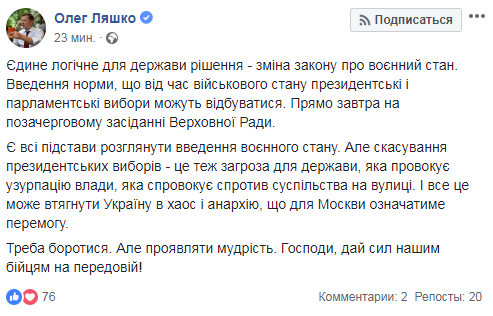 Есть все основания рассмотреть введение военного положения. Но отмена президентских выборов - это тоже угроза для государства, которая провоцирует узурпацию власти, которая спровоцирует сопротивление общества на улице. И все это может втянуть Украину в хаос и анархию, что для Москвы будет означать победу", - говорится в опубликованном сообщении на его странице в Фейсбуке.