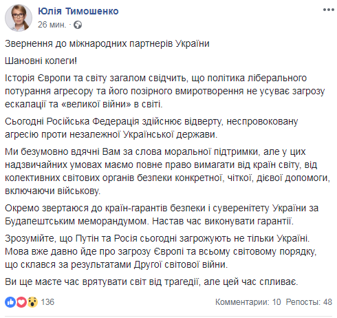 Она выразила благодарность за слова моральной поддержки и попросила оказать Украине "конкретную, четкую и действенную помощь, включая военную". При этом лидер "Батькивщины" в опубликованном обращении в Фейсбуке, ни разу не упомянула про военное положение, вопрос о котором через несколько часов планируют рассмотреть в Раде.