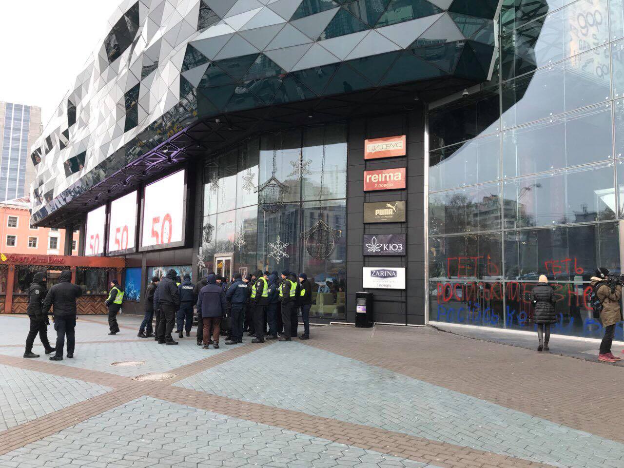 На месте находятся представители правоохранительных органов. На дверях видны надписи: "Бизнес на крови", "Не покупай у оккупантов", "Российское убивает", "Прочь российский бизнес". Самих активистов возле ТРЦ уже нет.