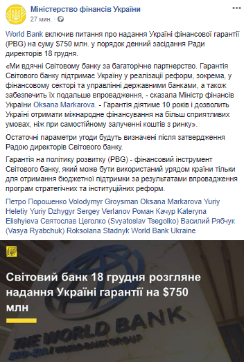 Всемирный банк включил вопрос предоставления Украине финансовой гарантии на сумму $750 млн в порядок дня заседания Совета директоров 18 декабря. Об этом на своей странице в соцсети сообщает Министерство финансов.