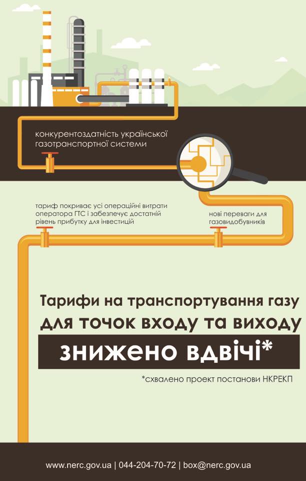 Во вторник, 27 ноября, Нацкомиссия по вопросам регулирования энергетики и коммунальных услуг (НКРЭКУ) одобрила проект постановления об уменьшении вдвое тарифов на услуги транспортировки газа для точек входа и точек выхода. Об этом сообщает глава НКРЭКУ Оксана Кривенко на своей странице в Facebook.