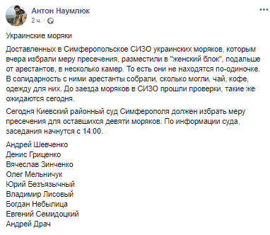 "Доставленных в Симферопольское СИЗО украинских моряков, которым вчера избрали меру пресечения, разместили в "женский блок", подальше от арестантов, в несколько камер. То есть они не находятся по одиночке. В солидарность с ними арестанты собрали, сколько могли, чай, кофе, одежду для них. До заезда моряков в СИЗО прошли проверки, такие же ожидаются сегодня", - говорится в сообщении журналиста.