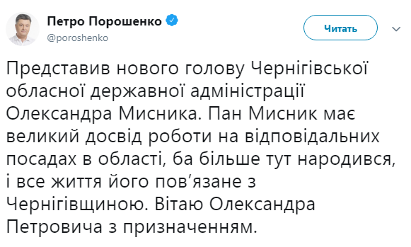 "Господин Мысник имеет большой опыт работы на ответственных должностях в области, более того здесь родился, и вся жизнь его связана с Черниговской областью. Приветствую Александра Петровича с назначением", - сказал Порошенко", - говорится в сообщении.