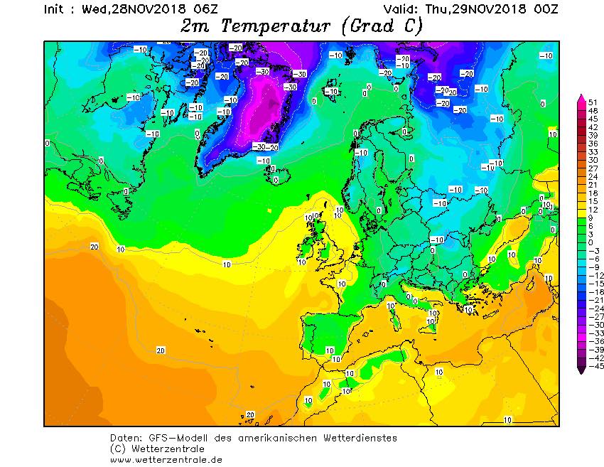 В четверг, 29 ноября, Украина попадает в воздушную полосу без осадков. Также во всех регионах кроме крайнего юга ожидается морозная погода -5...-12 градусов ночью и -3-7 С днем. В южной части Украины около нуля.