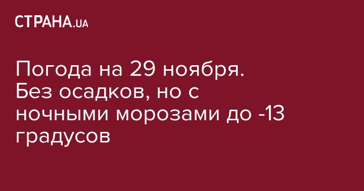 Сегодня, 29 ноября, в Украине ожидается морозная погода без осадков, днем - 4...-5 градусов, ночью до - 13 градусов. Об этом передает Укргидрометцентр.